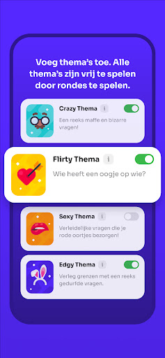 - Diverse thema's: kies uit vier verschillende thema's, elk met een unieke set vragen en uitdagingen om opwinding en plezier toe te voegen aan het spel. Of je nu zin hebt in een gekke avond met vrienden, een flirterige avond met je crush of een spannend avontuur, Boomit Party is de perfecte game.