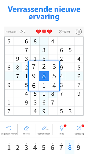 - Hint - als je vastzit, gebruik dan Hint en krijg een sudoku-oplossing alleen voor die cel!