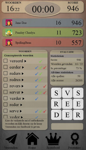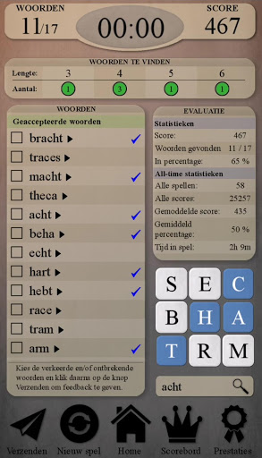 - Evaluatiescherm: statistieken, beschikbare woorden en animatie die uitlegt hoe deze te vinden, een link naar woordenboekvermeldingen van de onbekende woorden.