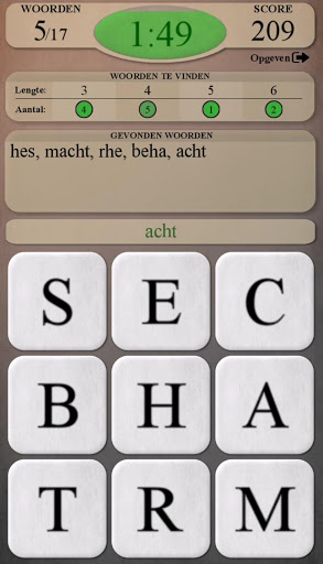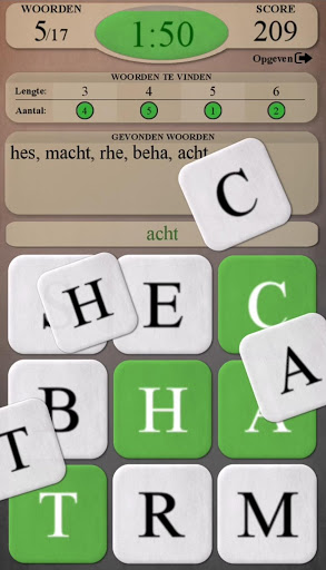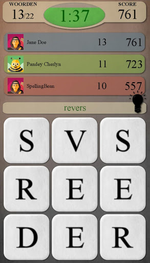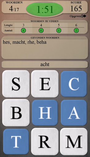 - Hint: elke 20 seconden verschijnt er een lampje. Als je deze aanraakt, dan worden de eerste twee letters van een woord (dat nog niet is gevonden) geopenbaard (lichtblauw - eerste letter, donkerblauw - tweede letter).