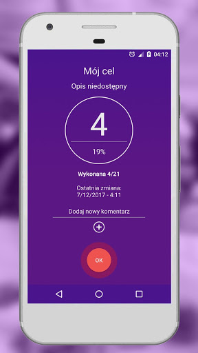 Przy każdym uruchomieniu możesz wpisać dowolny komentarz, który potem pojawić się w statystykach celów lub nawyków. Aplikacja 21 dni może pokazać szczegółowe statystyki dotyczące stworzonej przez cele lub przyzwyczajenia.