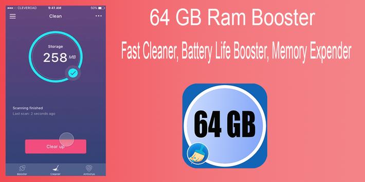 with small size and big effect, 64 GB Ram Cleaner booster , your best choice for clean memory, optimize performance. faster cache cleaner for both internal and external cash, system cache, app cache.
