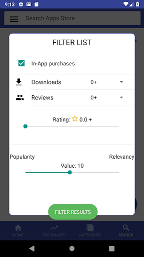 Filter games based on number of downloads, review rating, number of reviews, in-app purchases. For search you can also search based on popularity or relevancy.