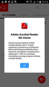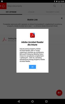 Program Adobe Acrobat Reader dla Microsoft Intune służy do pracy z plikami PDF, ich otwierania i wyświetlania w środowisku zarządzanym przez Microsoft Intune. Jeśli szukasz wersji programu Acrobat Reader dla klientów, pobierz ją stąd: https://play.google.com/store/apps/details?id=com.adobe.reader.