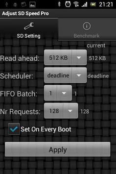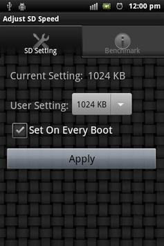 This app can adjust the SD card parameter "read_ahead_kb" in your Android Linux kernel setting. By setting the attribute, your mobile device and SD card read/write might gain better performance. The buffered read performance is highly correlated with running Apps on SD, browsing photo albums, etc. The write performance is not directly controlled by this attribute. By enlarging read buffer with reducing read action to SD, write command can be done more quickly and efficiently without being interrupted by multiple separate SD read command. On the mobile device equipped with less memory space, it's recommended not to set the buffer size larger than 1024KB. The larger buffer size is good but it might affect the available memory space used by other buffers and normal Apps. It could result in bad performance due to Android needs to kill inactive Apps and recovery memory frequently.