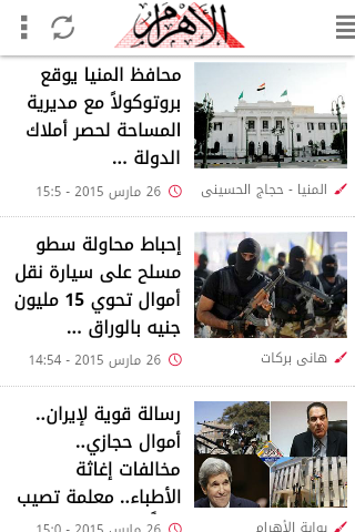 Aplikacja Al-Ahram Sublicowana przez Al Ahram Egyptian Foundation i dostarczanie zerwania wiadomości z Egiptu w tym czasie jego wystąpienia, a także tematów pierwszej strony Al Ahram Egipskie i Codzienne kolumny i śmiertelność. Aplikacja oferuje również aktualności, gospodarki i najnowszą giełdę. Wniosek dotyczy egipskiej wiadomości sportowej, zwłaszcza ligą ogólną, a także wiadomościami arabską i międzynarodową, a także wiele podstawowych i charakterystycznych właściwości stosowania al-AHRAM, w tym: uzyskanie najnowszej złamania, tematów początkowej strony, sportu, Zgony i giełda., Gospodarka, Aktualności, Technologiczne i samochody.