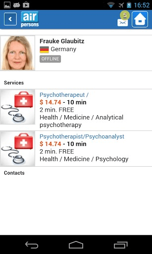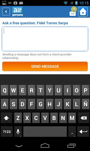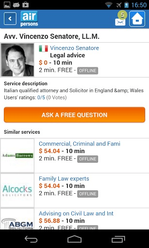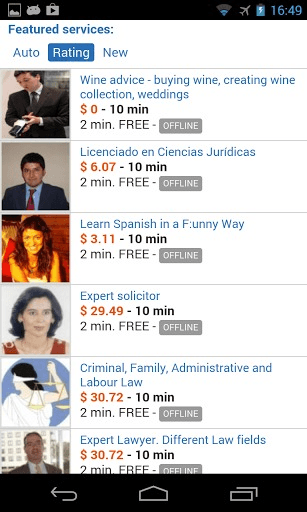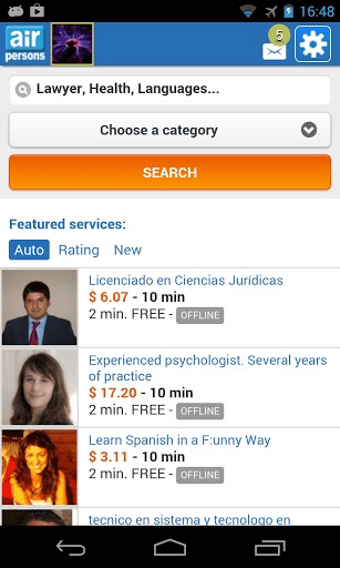 IMPORTANT NOTICE: Only during this month you can get up to $ 40 for free to spend in consultations and services when downloading the App and signing up before the end of the month Description. It allows you to make chat consultations with doctors, lawyers, psychologists, language teachers, computer experts, and more. Ask questions for free, just contact them. Buy and sell services online. Earn money answering questions on your mobile. If your phone runs on Android 4.1 or higher you can make calls and answer queries through video-chat. Obtain 40$ free in services and consultations just for signing up. Features. Search by categories. Find doctors, psychologists, lawyers, teachers, any online expert speaking your language who can answer your question immediately. Professionals search. Lets you search any professional by name to find if they offer their services in AirPersons. Word search. There are over 1000 categories of services; you can find many different ones: personal trainers, spirituality, tarot reading, astrology, personal shopper. Internal mail. Send your questions and consultations for free to any professionals you want. Answer your customers’ questions. My account. It allows you to check your balance in AirPersons and add funds to your account to buy services. NOTE: This AirPersons mobile App version does not allow you to create your own services. If you want to create a service you must do so through the website.