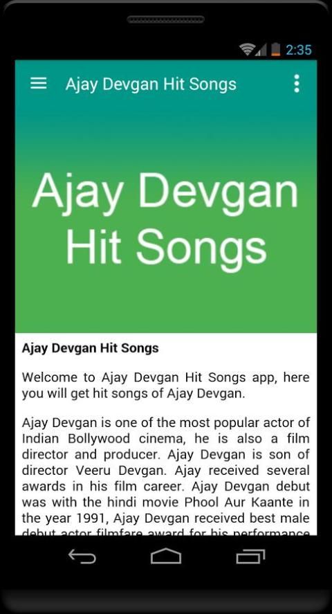 Ajay Devgan is one of the most popular actor of Indian Bollywood cinema, he is also a film director and producer. Ajay Devgan is son of director Veeru Devgan. Ajay received several awards in his film career. Ajay Devgan debut was with the hindi movie Phool Aur Kaante in the year 1991, Ajay Devgan received best male debut actor filmfare award for his performance in this movie. Some of Ajay Devgan hit hindi movies are Jigar, Dilwale, Suhaag, Naajayaz, Diljale, Ishq, Zakhm, Hum Dil De Chuke Sanam, Deewangee, The Legend of Bhagat Singh, Raincoat, Yuva, Apaharan, Golmaal, Halla Bol, Golmaal Returns, Golmaal 3, Raajneeti, Singham, Bol Bachchan, Son of Sardar, Singham Returns, Drishyam. Ajay Devgan is one of the actor who acted in more than 80 hindi movies. Ajay Devgan married most famous Indian film actress Kajol in the year 1999. Ajay Devgan recent movie was Drishyam and was super hit. Ajay Devgan upcoming hindi movies are Baadshaho opposite Shruti Haasan and Shivaay. In this app you will get hindi songs of Ajay Devgan.