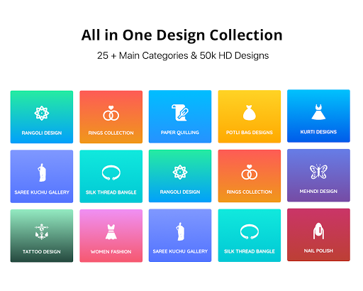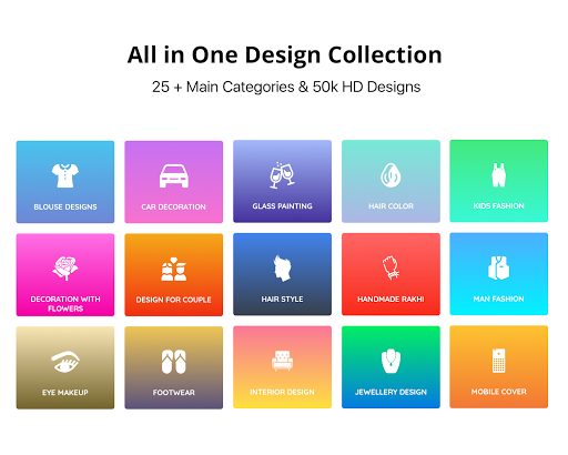 All in One Design Collection App provides many categories which are sub divide into sub categories.