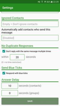 Automatically reply to custom received WhatsApp messages with the help of this app. You have a lot of settings to customize the bot for your needs. Just try it out!