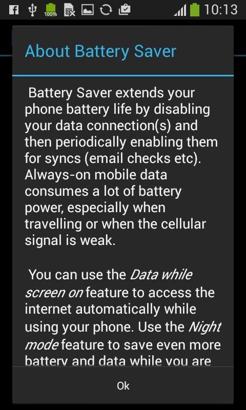 Battery Saver extends your phone battery life by disabling your data connection(s) and then periodically enabling them for syncs (email checks etc.). Keeping your battery forever on consumes lot of battery power and shortens the life span of the battery and consequently the life of your android device.