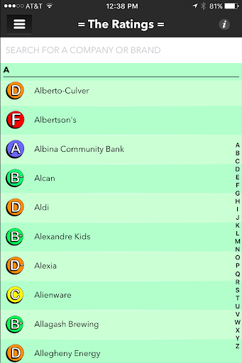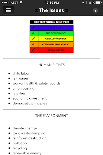Lepszy światowy shopper pozwala konsumentom etycznym dokonać świadomych wyborów dotyczących marek i firm, dostarczając rankingu A do F opartą na rekordzie Companys w obszarach: praw człowieka, zrównoważonego rozwoju środowiskowego, zaangażowania społeczności, ochrony zwierząt i sprawiedliwości społecznej.Wszystkie dane wykorzystywane w tym systemie rankingowym zapewniają niezależne, źródła osób trzecich, które można weryfikować przez samych konsumentów.Na podstawie tego samego systemu, co bestselled World World Shopping Guide, w tym ponad 25 lat danych, ta aplikacja umożliwia konsumentom głosowanie z dolarami.