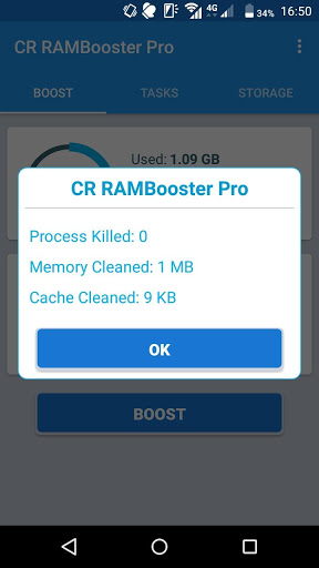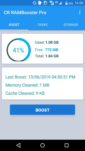 Niniejszy RAM Booster Pro może zwiększyć pliki RAM i czyszczenia na śmieci, aby zwiększyć mobilny średnio 70-80% szybciej. Wystarczy stuknąć przycisk "Boost", aby uaktualnić swój telefon za pomocą jednego kliknięcia i uaktualnij wszystkie wątki, które są używane z powrotem. Może nawet oszczędzać baterię i pokazać prędkość telefonu komórkowego za pomocą procentu. Spełnia również wszystkie narzędzia i błędy RAM podczas klikania.