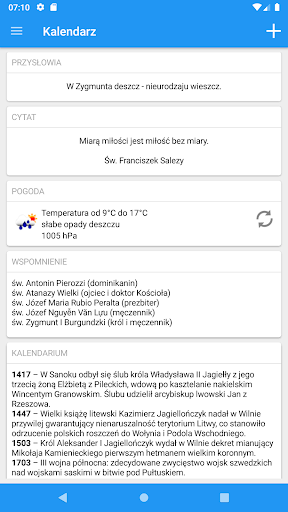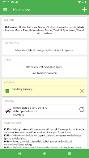 Zawiera informacje o polskich świętach państwowych i kościelnych, świętach nietypowych, imieniny, przysłowia, cytaty, kalendarium, niedziele handlowe, wspomnienie świętych na każdy dzień, własne notatki oraz prognozę pogody na 16 dni (aktualizowana z internetu)