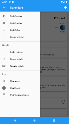 Widget ekranu głównego - kartka z kalendarza - prezentuje bieżący dzień, wschód i zachód słońca, fazy księżyca i jego wschód i zachód, znak zodiaku, imieniny, wydarzenia oraz historyczne.