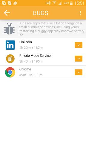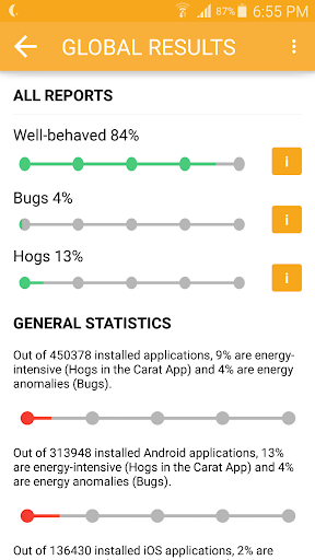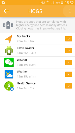 Carat will tell you which apps it thinks are hogs (they use a lot of battery) and which are bugs (they use a lot of battery on your device but not most others). Being a hog or a bug does not make an app 'bad', but a user trying to improve their battery life can use these designations to adjust their behavior.