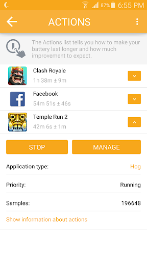 Ever wondered why your battery is draining so quickly? Just install Carat, open it every few days so it can send data to our servers, and within a week Carat will start recommending Actions (just for you!) and even predicting the improvements you will see. Although Carat cannot measure energy use directly, it infers what apps are responsible using advanced machine learning methods.