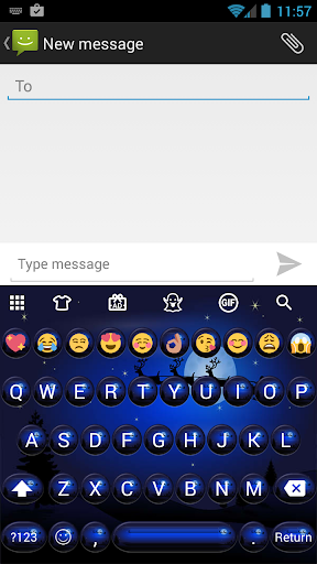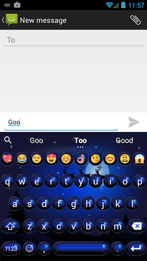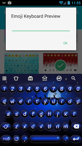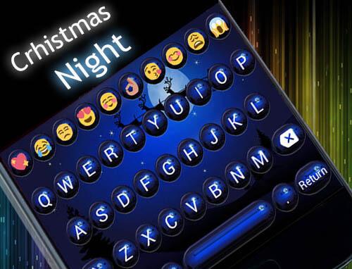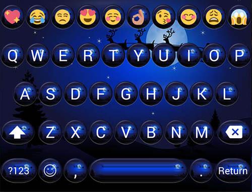 Jest to motyw niebieski okrągły przyciski kulki w tle z Santa Claus latający niebo z jego reniferów, aby przynieść prezenty dla dobra dzieci na świecie dla aplikacji Emoji klawiatury (wersja Cute lub Premium lub KK), w noc Bożego Narodzenia: Zainstaluj Emoji klawiatury głównej program ma używać do tego tematu.