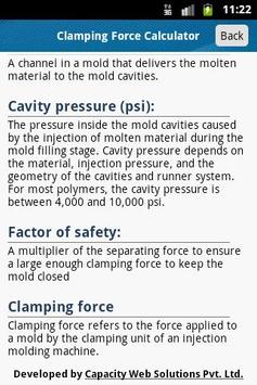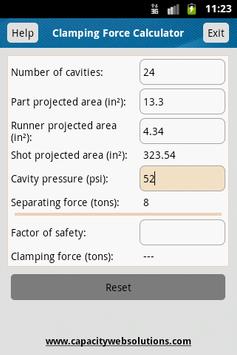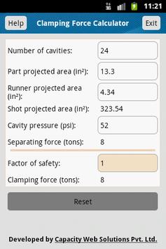 Clamping Force Calculator is a tool to calculate the Clamping Force in the injection molding machine based on the different area’s like part projected area, runner projected area, cavity pressure and number of cavities.