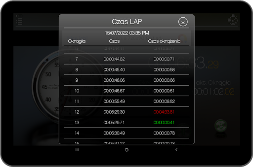 - Wyświetlane jest ostatnie okrążenie wraz z czasem.