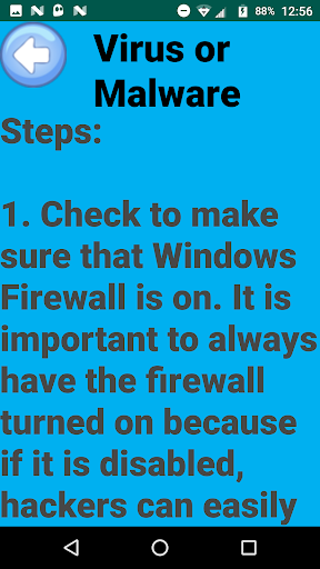 Ten przewodnik bezpieczeństwa komputerowego jest dostosowany do osób, które chcą szybko naprawić problemy, które napotkali na swoim komputerze. Ta aplikacja zawiera poprawki do następujących problemów: wirus / złośliwe oprogramowanie, błękitne / tylne ekrany i spowolnienia komputerowe. Tutoriale w tej aplikacji są przeznaczone dla użytkowników systemu Windows 10, ale niektóre z kroki mogą być przestrzegane dla innych wersji systemu Windows. Jest to świetna aplikacja dla każdego, kto chce szybko naprawić problemy z komputerem z ograniczoną wiedzą lub doświadczeniem technicznym. Instrukcje krok po kroku są łatwe do śledzenia, a rozmiar czcionki jest większy niż tradycyjny przewodnik komputerowy, ponieważ zajmujemy się, aby zapewnić, że nasi użytkownicy mogą naprawić własne problemy za pomocą naszej aplikacji.