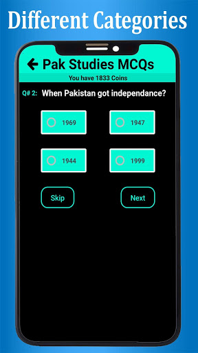have different categories in Multiple choice questions , such as General-Knowledge ,Science And Pakistan-Studies.