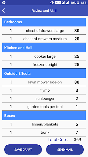 Zaprojektowany, aby firma usuwająca do wprowadzenia szczegółów klienta do przeniesienia i korzystania z szerokiej listy możliwych treści, wybiera meble i efekty z tej nieruchomości, aby skompilować listę i całkowity wolumen, a następnie może wysłać e -mail lub zapisać tę listęz jego tabletu lub telefonu.