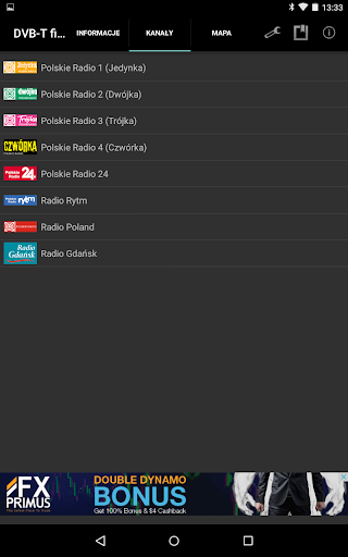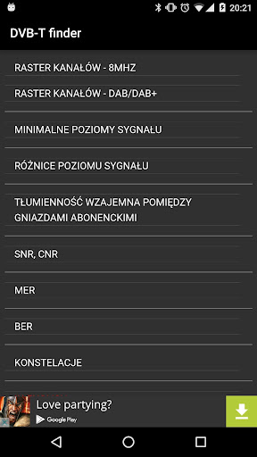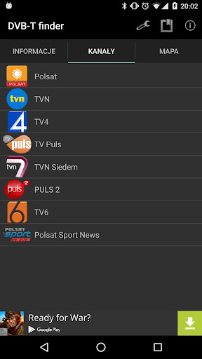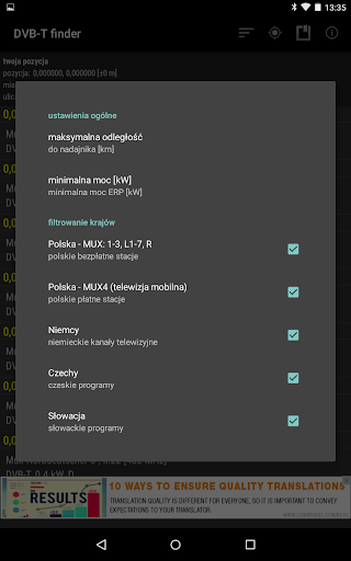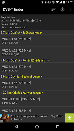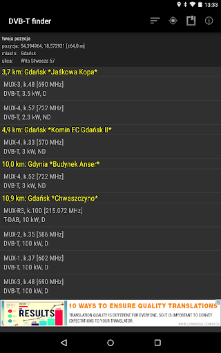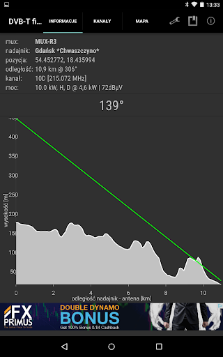 Wyszukiwarka najbliższych polskich nadajników DVB-T i T-DAB. Wyszukuje nadajniki na podstawie GPS lub podanego adresu. Dodatkowo wyświetla mapę oraz wykres zależności wysokości terenu od odległości na odcinku antena nadawcza - antena odbiorcza.