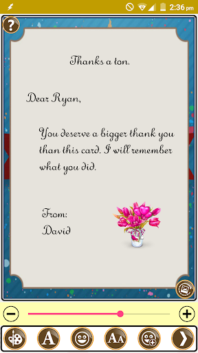 Możesz dodać naklejkę na zaprojektowanym karcie z pozdrowieniami lub przeglądać obraz z galerii zgodnie z potrzebą. Aplikacja z pozdrowieniami Umożliwia użytkownikowi dodawanie zamówionego tytułu pozdrowienia i wiadomości na karcie z pozdrowieniami, a następnie wprowadź do i zgodnie z odpowiednimi szczegółami. Dziękujemy, Greeting Maker App zapewnia obiekt zapisywać zaprojektować kartkę z życzeniami i udostępniać przez WhatsApp Google Facebook Gmail Twitter itp.