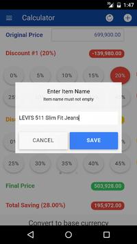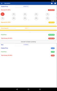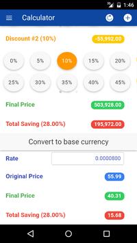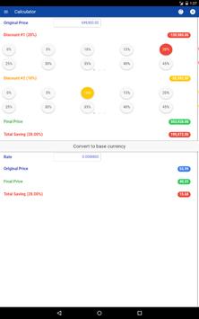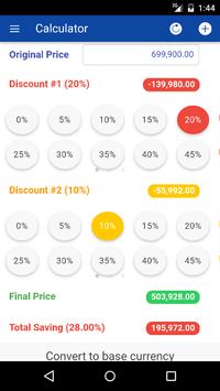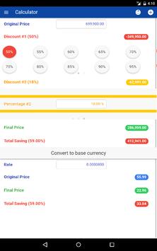 This application provides a shopping calculator to the final or discounted price after the percent off discount is applied. In addition, it allow you can convert to your base currency. Use this application when shopping or purchasing at retail stores when there is a promotion or anything that has a percent based sale.