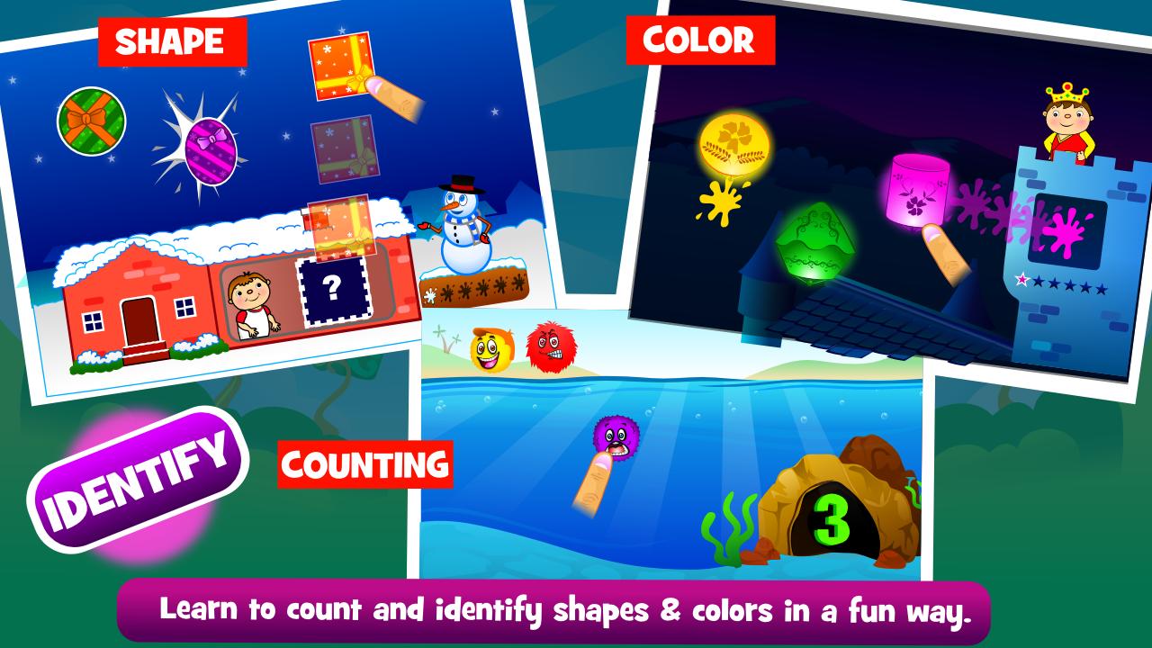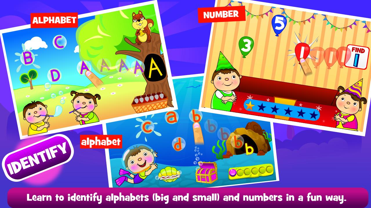 The child will get to learn how to identify them in a fun way by bursting balloons or touching on gifts and floating objects. Your toddler will also get to learn how to associate common words with letters (e.g. A for apple) and learn counting from 1 to 10.