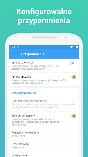 Możesz włączyć automatyczne i ustawić ręczne ustawienia czasu, gdy przypomnienia powinny przyjść do picia wody.