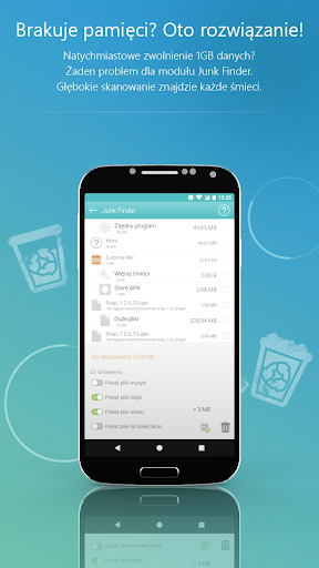 Zainstalowane aplikacje, pobrane pliki, obrazy, muzyka i wideo - po jakimś czasie, Twój smartfon jest coraz bardziej ociężały i spowalnia. Ashampoo Droid Optimizer uwalnia Twój smartfon z niepotrzebnych plików odzyskując miejsce i wydajność - regularnie i w pełni automatycznie. Musisz regularnie usuwać foldery po pobraniach? Dodaj je do Przyspieszenia 1-kliknięciem i automatycznego czyszczenia. Ta funkcja wspierana jest także przez Junk Finder!
