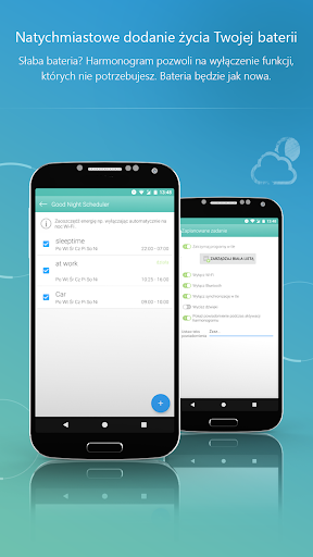 Dzięki zintegrowanemu harmonogramowi Na Dobranoc, można wyłączyć funkcje takie jak WLAN czy łączność mobilna czy ograniczyć ich użycie. Pozwól Twojemu smartfonowi odpocząć i zregenerować zużycie baterii dzięki Ashampoo Droid Optimizer.