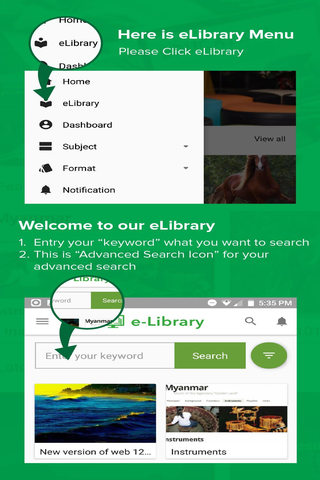 Ta aplikacja do biblioteki e-biblioteki jest rozwijana przez Ministerstwo Edukacji Myanmar w celu uzyskania dostępu do zasobów dydaktycznych i uczenia się odpowiednich dla specjalistycznego programu edukacji nauczycieli.Biblioteka elektroniczna zapewnia zasoby, które są zgodne z programem nauczania edukacyjnego nauczycieli obecnie wdrażane w szkołach edukacyjnych w Myanmar.Korzystanie z biblioteki e jest przeznaczone wyłącznie do celów edukacyjnych.