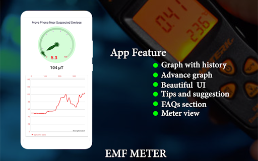 Miernik EMF Pole elektromagnetyczne korzysta z kompasu czujnika magnetycznego Smart Telefon i wyświetlanie odczytów wynikowych z miernikiem EMF i wykresem EMF. To Field Field Finder jest jedną z najlepszych aplikacji EMF Detector dla Androida. Wykrywanie pola elektromagnetycznego jest możliwe dzięki tym metrze EMF. Ten Miernik Ghost EMF jest znany jako radary tracker i rejestrator EMF