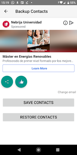 Ta aplikacja umożliwia pobieranie i przechowywanie danych kontaktowych w bazie danych W Internecie do odzyskiwania w innym telefonie komórkowym z systemem Android. Więc możesz szybko i łatwo odzyskać wszystkie kontakty w przypadku kradzieży lub utraty terminala. Również aplikacja wysyła Ci wiadomość e-mail z kontaktami i można pobrać w formacie "CSV" lub "VCF".