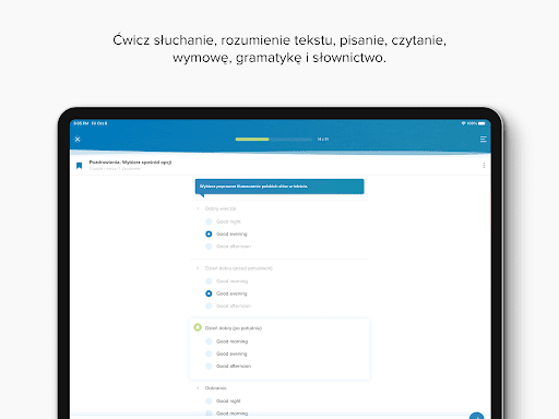 Ćwiczysz wszystkie umiejętności językowe - słuchanie, rozumienie, czytanie, pisanie, wymowę, gramatykę i słownictwo.