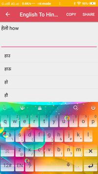 There are a lot of English to Hindi writing app in the market. But this English to Hindi typing application will come handy to you in a lot of occasions. If at all you are facing any problems of getting Hindi text of any English word then this English to Hindi type writer application will be of utmost use to you. You can also use this application as a substitute to English to Hindi dictionary with its precise translation. You can use this English to Hindi conversion application to fulfill all your needs of translations. This English to Hindi translation keyboard is sure to help you with all of your conversion needs and will definitely be an asset to you.