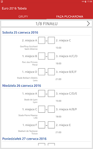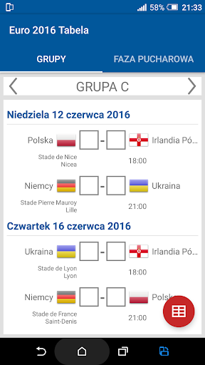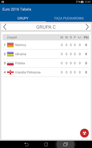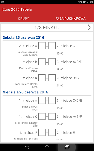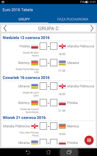 Trzeba wprowadzić tylko wyniki meczów, a aplikacja sama zbuduje wszystkie tabele grup i wyliczy jakie polecenia awansuje do play-off. Również w załączniku znajduje się harmonogram meczów (czas i miejsce). Śledź mecze i prowadzi własną tabelę mistrzostw europy w piłce nożnej ME 2016.