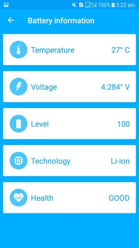 ✓ Detailed battery information within the main screen of the app. You will be able to see the percentage of battery energy as well as Temperature in C°, Voltage of battery and finally the level.