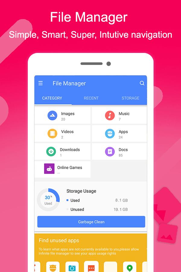 Infinite File Manager - Explorer, Clean & Transfer is a free, secure tool that helps you find file faster, manage files easily, and share them offline with others. It supports tons of cool features: quick search, moving, deleting, opening, and sharing files, as well as renaming, unzipping, and copy-paste. File Manager also recognizes multiple file formats, including music, videos, images, documents, APKs, and zip-files and Easy share files offline.