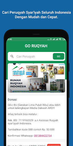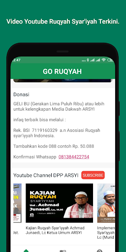 : Ta aplikacja zawiera tematy Ruqyah syar'iyyah, które Bóg będzie dodawany za każdym razem, gdy pojawia się nowe pismo. Kodeks etyki terapeuty, Sop Ruqyah Syar „Iyyah dla terapeutów Arsyi. Czwarty: Struktura zarządzania Arsyi z poziomów DPP, DPW, DPD w całej Indonezji.