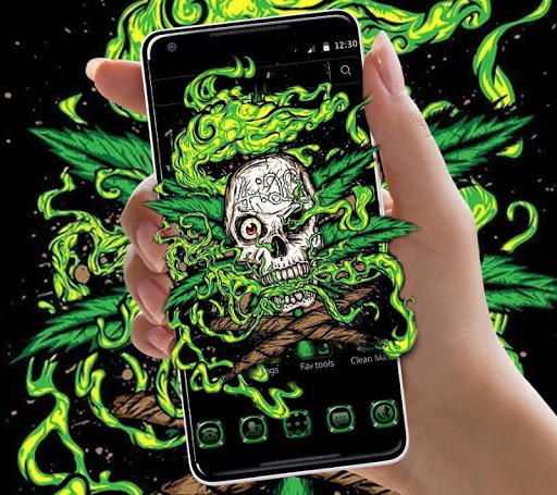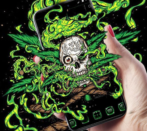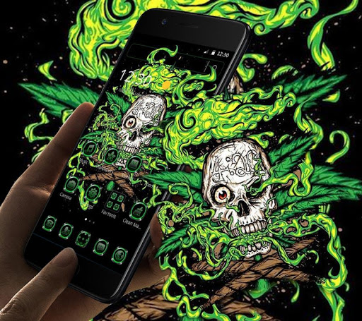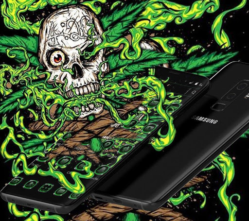 Green Weed Skull Theme ma tła czaszki, zielone ikony aplikacji chwastów, tapety mody czaszki i straszny efekt cyfrowy. Ten zielony program Launcher (Icon Pack) jest specjalnie zaprojektowany dla osób czaszki, którzy kochają przerażający motyw.