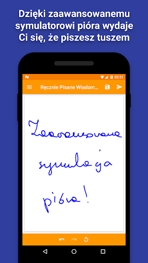 Ta aplikacja używa technologii zaawansowanej symulacji pióra, by Twoje pismo odręczne wyglądało jak pisane prawdziwym piórem z tuszem. Nic nie sprawi, że Twoje wiadomości będą eleganckie i oryginalne, tak jak tusz i Twoje własne odręczne pismo. Przez użycie algorytmu wygładzania, linie wyglądają niesamowicie i gładko.