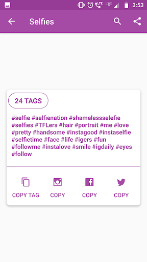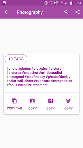 You may get more likes and followers using this hashtags app in your photos on Instagram, Facebook and Twitter status. Fast, easy and the best tags!