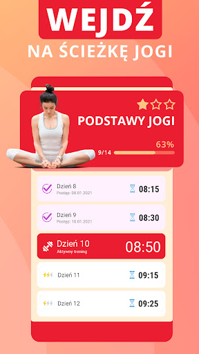 Każdy codzienny trening ma coraz wyższy poziom trudności. Zaczynasz od najłatwiejszych lekcji i kroków. Napraw swoje wyniki. Później poziom trudności stopniowo się zwiększał. Ćwiczenia joga dla jednej osoby (daily yoga poses & workouts) jest podzielony na dwie kategorie: statyczną i dynamiczną z wideo. Podczas treningu płynnie się zastępują. Ćwiczenia są odpowiednie dla mężczyzn, kobiet, a nawet seniorów.