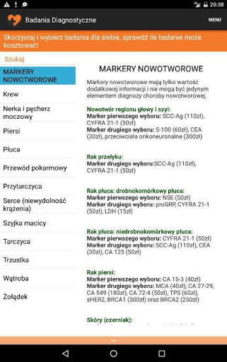 Dodano nową kategorię badań "Markery nowotworowe" w której znajdują się pakiety markerów przyporządkowane do konkretnych nowotworów. Markery nowotworowe mają tylko wartość dodatkowej informacji i nie mogą być jedynym elementem diagnozy choroby nowotworowej. Podwyższone stężenie markera nie musi świadczyć
