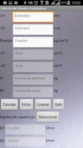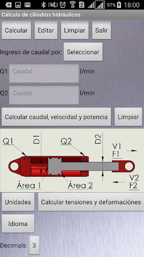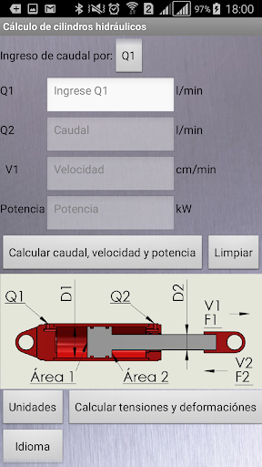 Wejście: Średnica cylindra, średnica trzpienia, ciśnienie robocze i przepływ dochodu: Cylinder Obszar