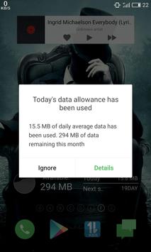 user exceeds average daily usage of mobile internet data. In notifications application displays current internet speed, available mobile data (by default monthly data plan is 1024MB), today's mobile data usage and today's wifi data usage. In application there are displayed available mobile data and daily recommended data usage.